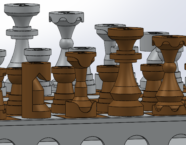 A chess set design, with an added design challenge of having all the pieces being able to be stored within the board.