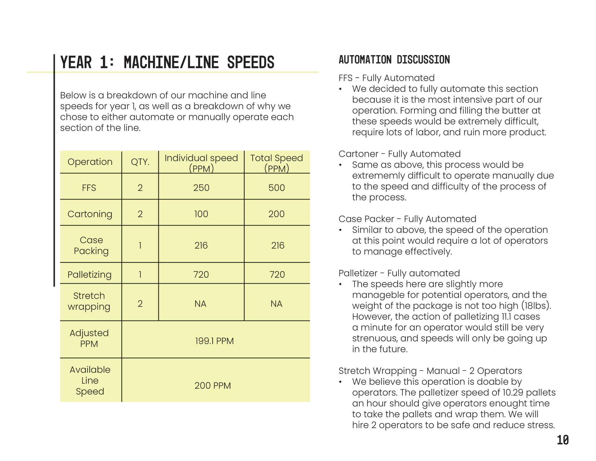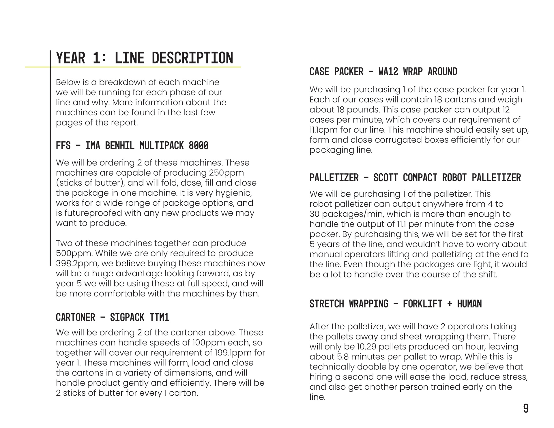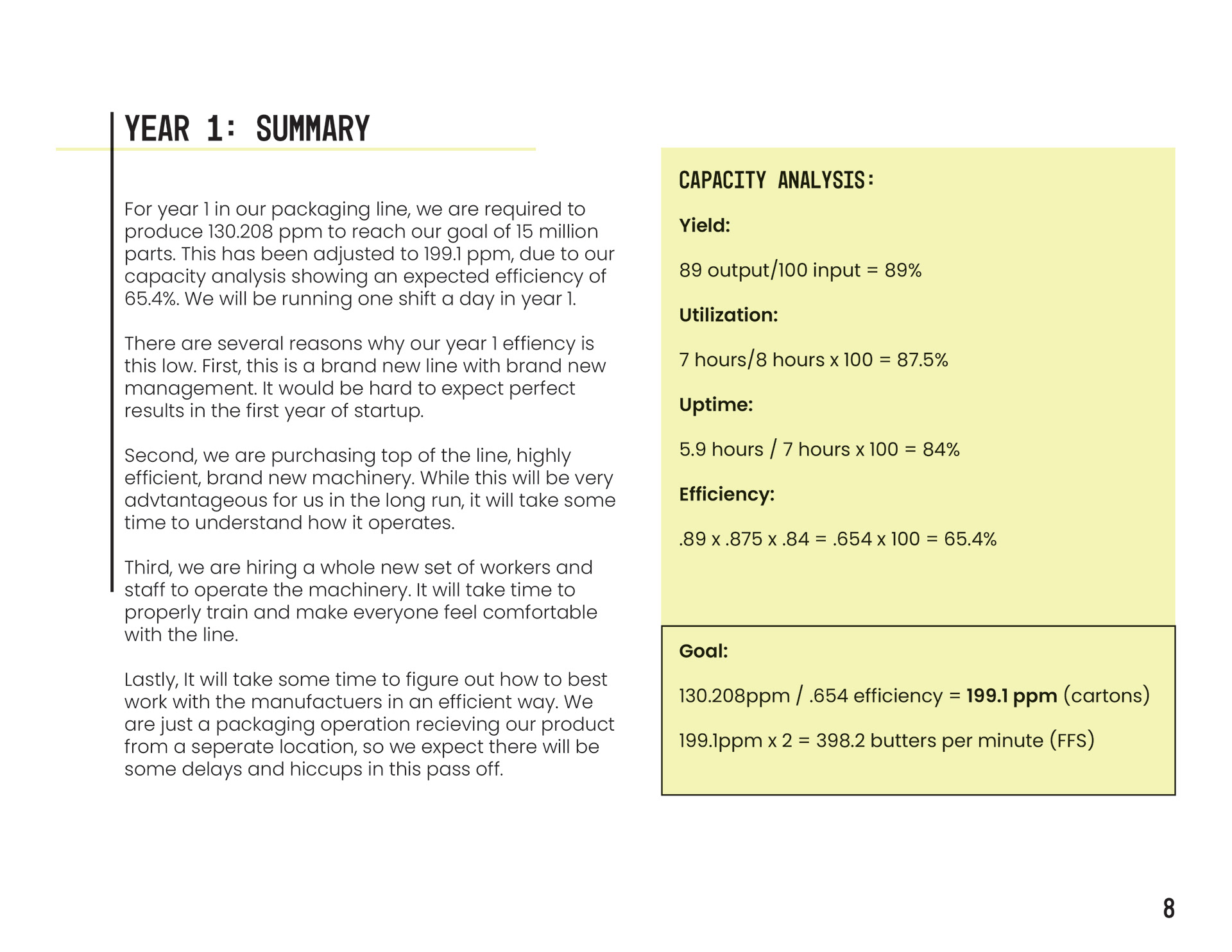 This project was a 2 person group project, where the objective was to make a mock packaging line for a selected product, and a predetermined output, over the course of 5 years.