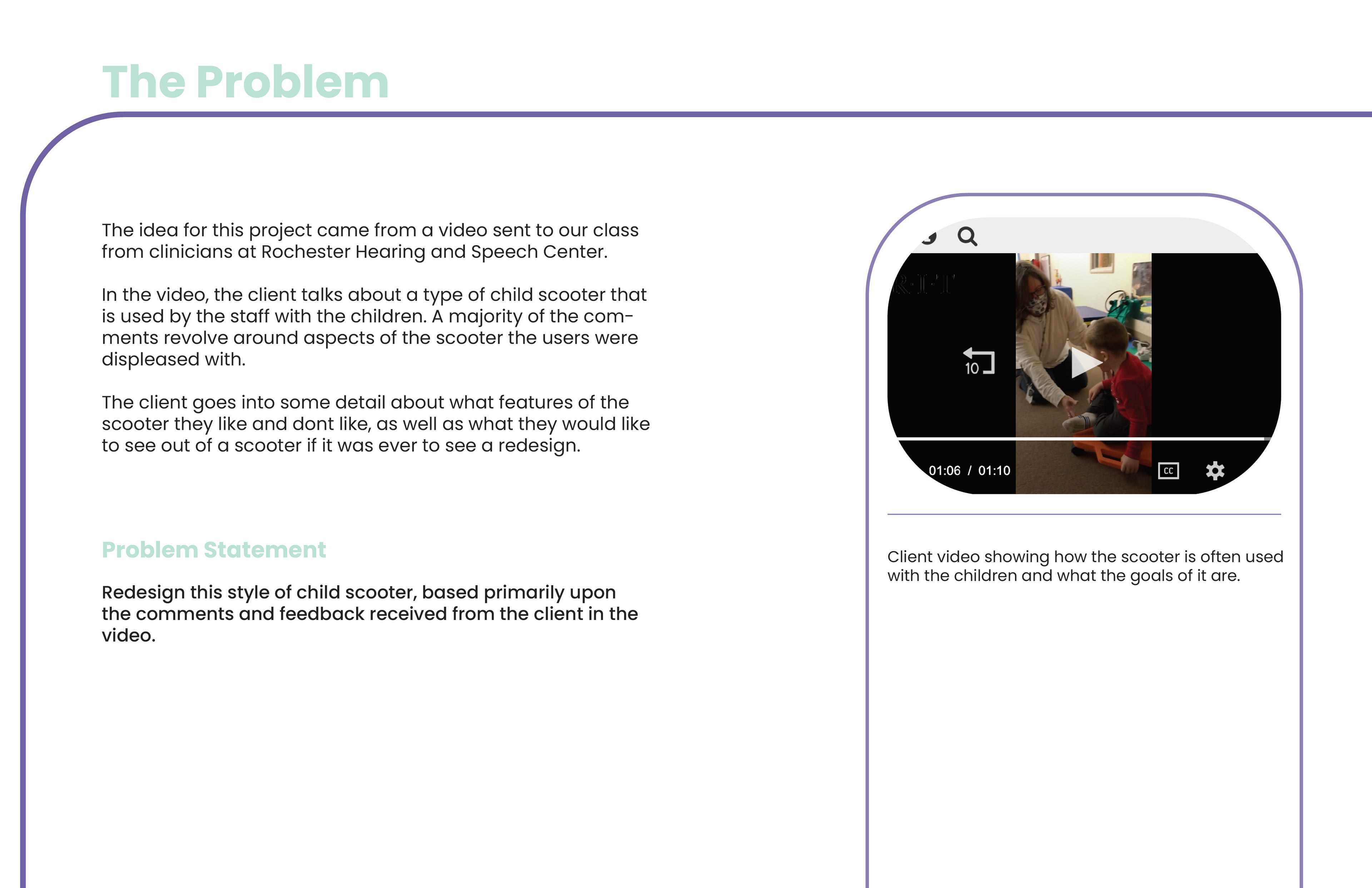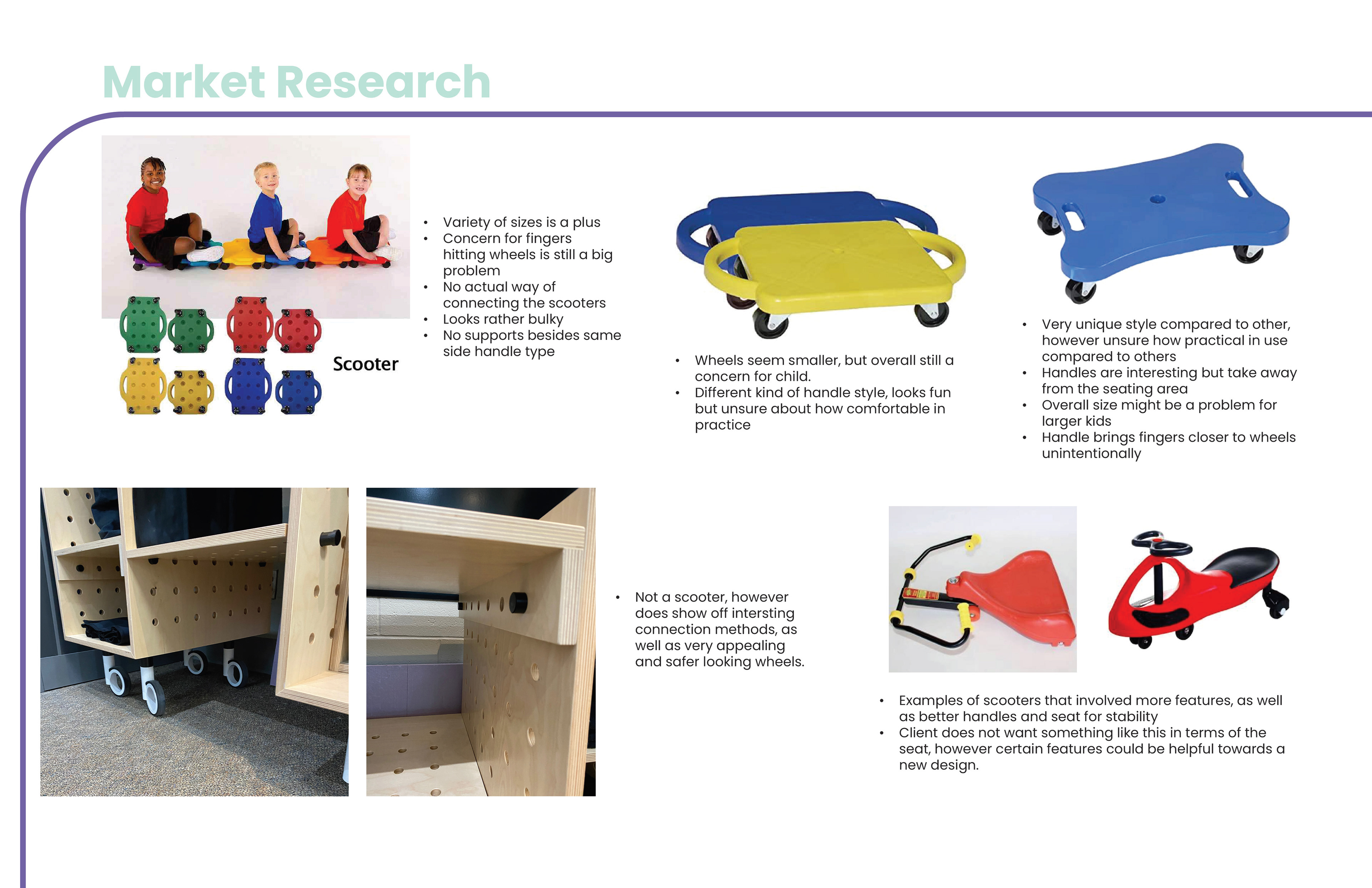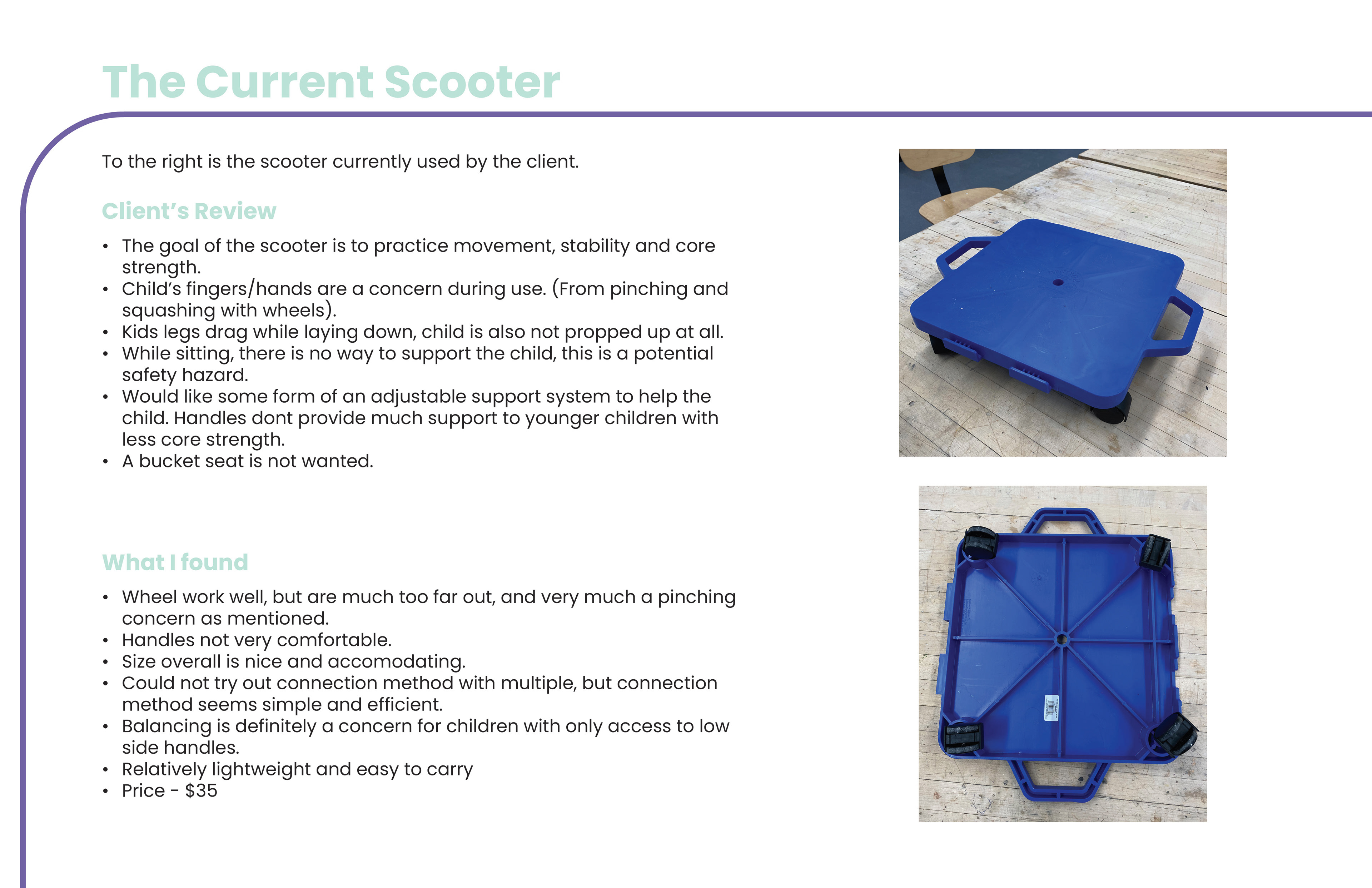 Scooter Boards are great tools for fun and learning among children. However, the current design leaves a lot to be desired. This is a project based upon feedback from Clinicians at Rochester Hearing and speech center.